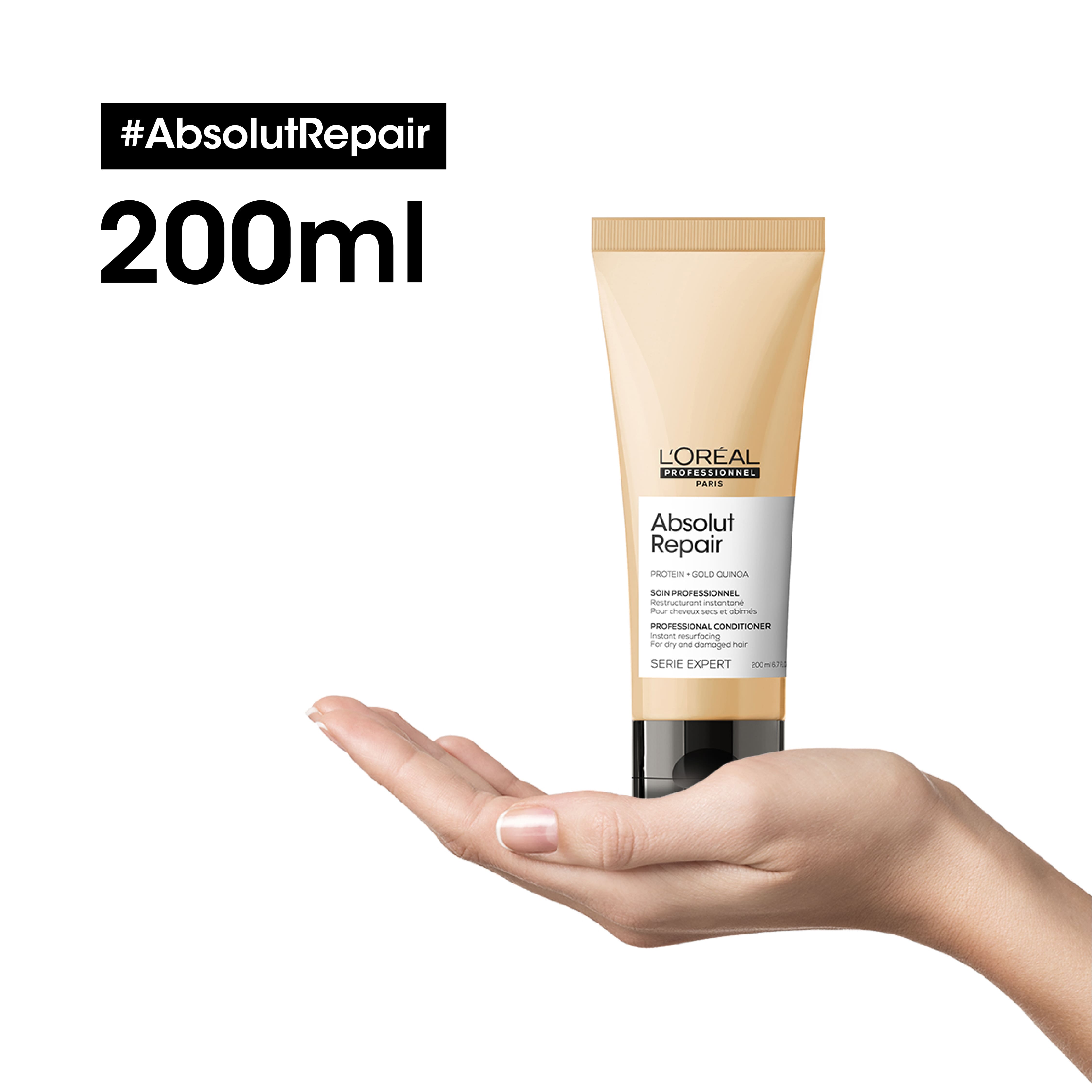 El acondicionador Absolut Repair ofrece la mejor experiencia de reparación profesional para el cabello dañado y seco. El acondicionador repara visiblemente el cabello dañado con un tacto muy ligero y suave, trata y desenreda sin dañar el cabello.